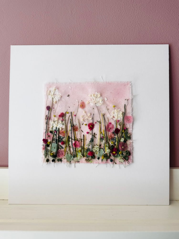 This piece measures 16cm and is mounted on white board 28cm x 28cm ready to frame and enjoy — a little window into a stitched garden.