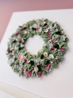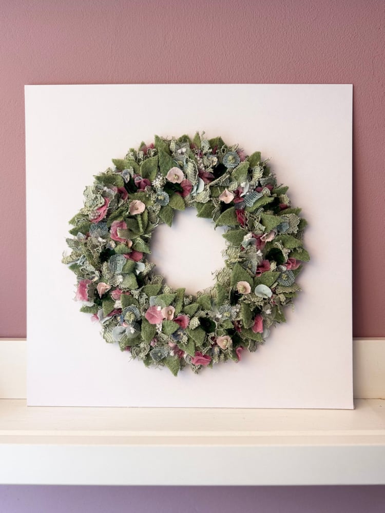 The wreath is everlasting — no fading flowers, just beautiful fabric and lace that you can enjoy all year round. It looks lovely framed or standing on a shelf.
