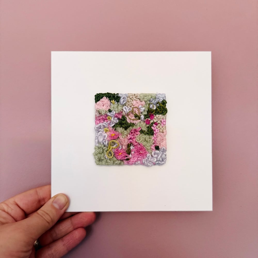 The embroidery measures 7cm x 7cm and is mounted on a 16cm board, ready to frame or display as it is — perfect for bringing a touch of nature-inspired texture to your space, or as a thoughtful gift.